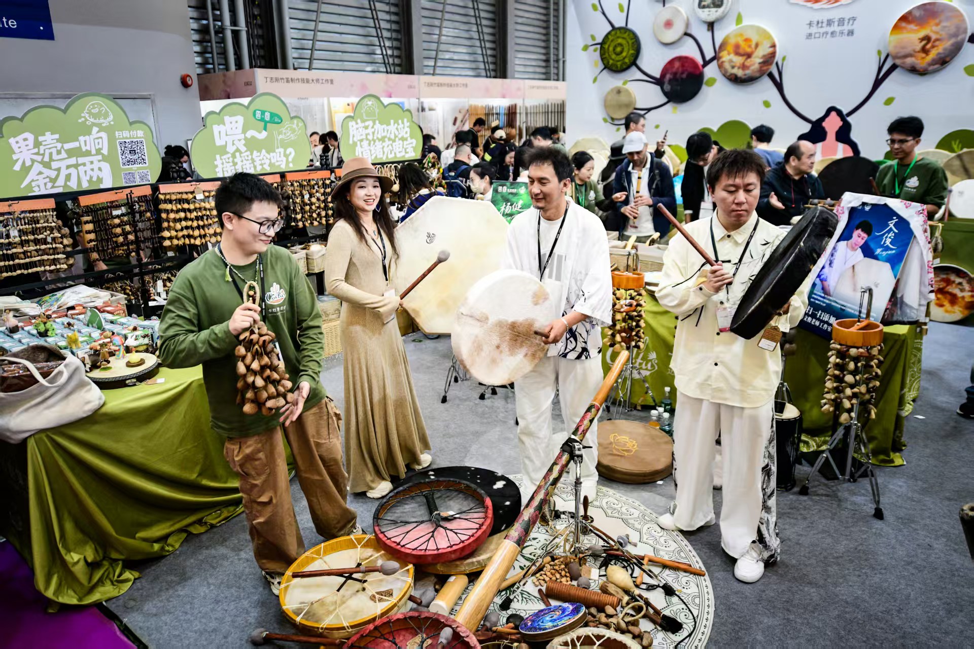 头图为本届乐器展上的音乐疗愈展位前,工作人员在表演乐器。劳动报记者 颜筱依 摄影