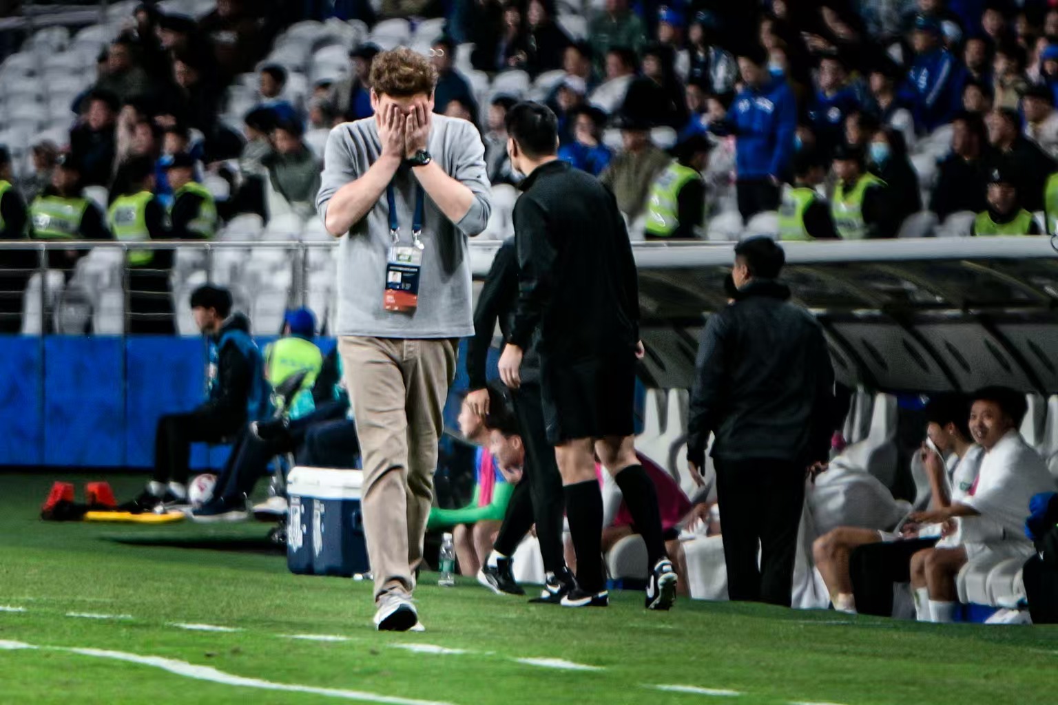 上海申花主教练斯卢茨基在球场边无奈掩面。劳动报记者颜筱依 摄影