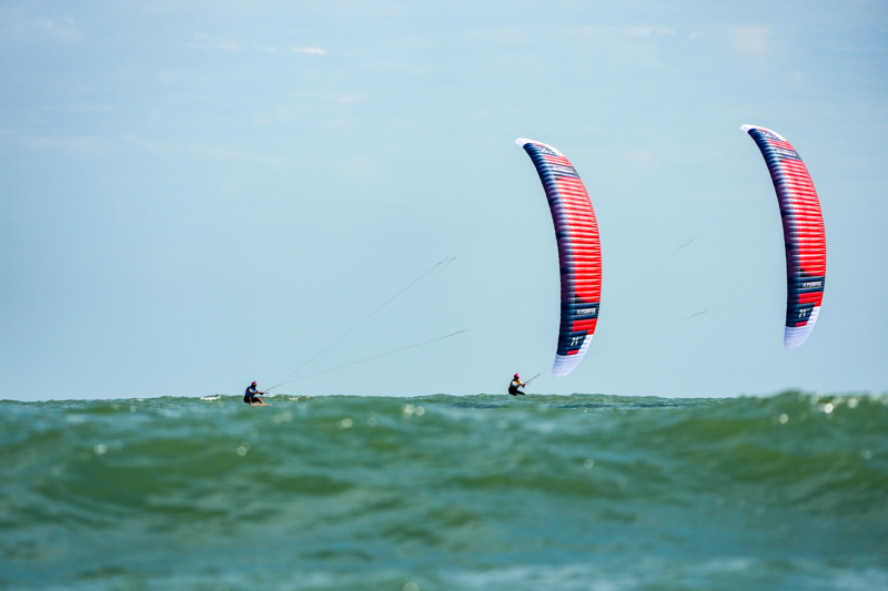 上海队选手黄齐滨(右)与山东队选手张浩然在男子水翼风筝板级比赛中,他们分获该项目冠亚军。新华社图