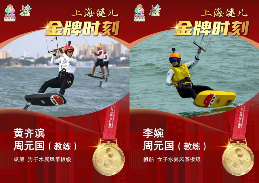 头图为上海运动员分别夺得男子和女子水翼风筝板冠军。上海体育图