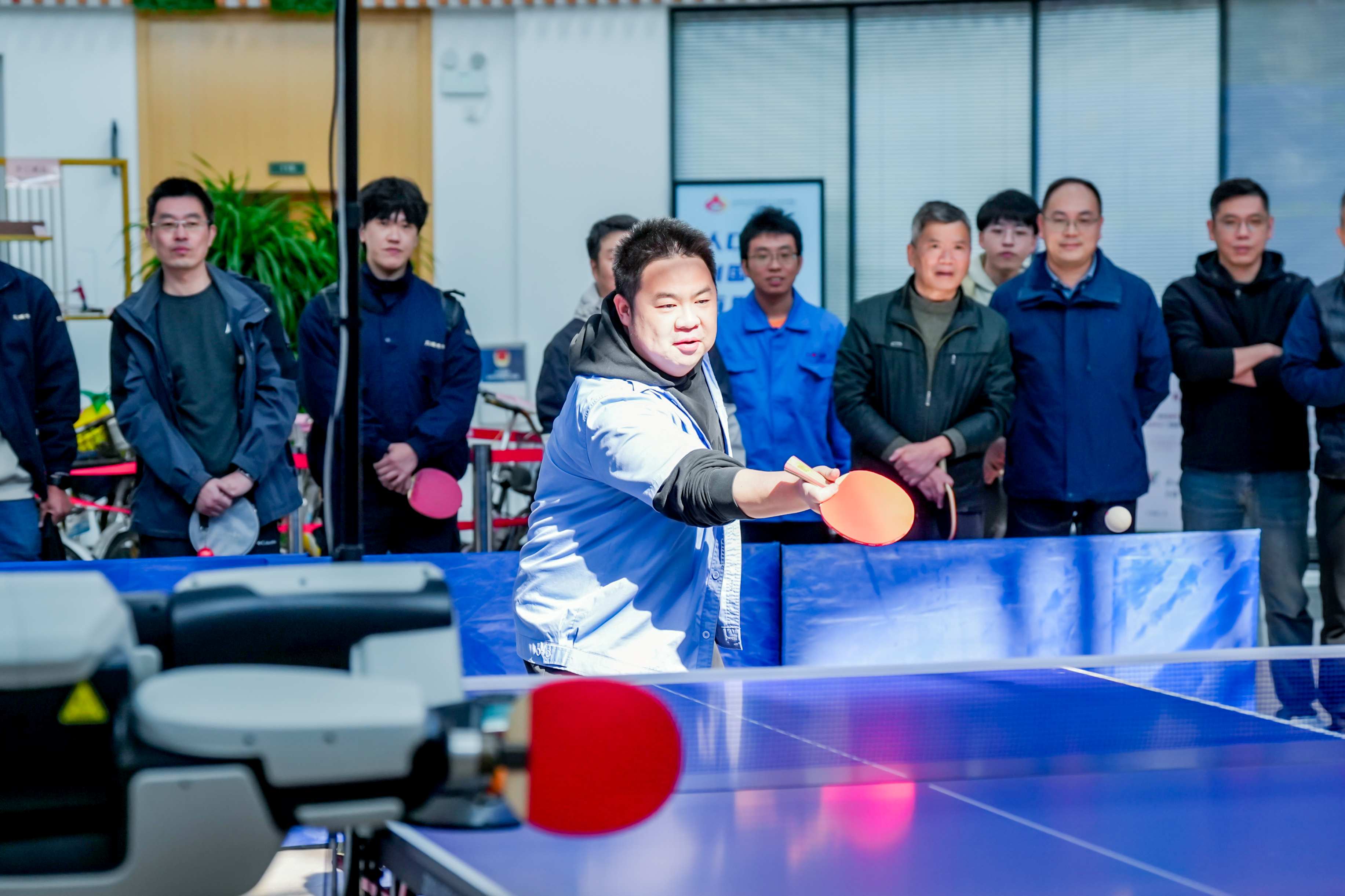 赛场上,“啪”“砰”的清脆击球声此起彼伏。参赛选手们全神贯注,目光紧锁庞伯特机器人的出球轨迹,时而跨步侧身,时而屈膝降重心,不断调整姿态以精准控制回球的力量、速度、落点与弧线,展现出专业的竞技风貌。