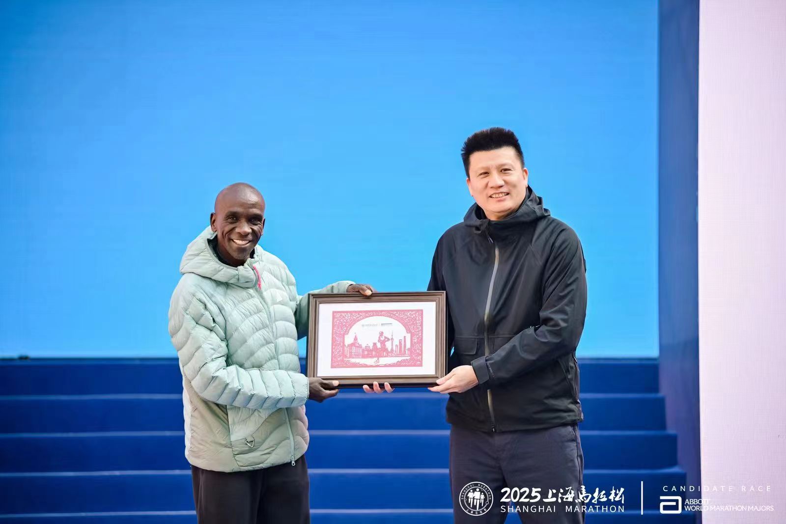 发布会当天,两届奥运会冠军、原世界纪录保持者、11座马拉松大满贯冠军获得者基普乔格也惊喜亮相,并向上马组委会赠送了一双全新的基普乔格系列跑鞋,传递他对上海马拉松专业性的高度认可。上马方面则送上了一幅融合中国传统剪纸技艺与现代体育精神的艺术品作为回礼,剪纸中央,基普乔格奔跑的姿态与外滩建筑群交相辉映,既是上马对这位马拉松传奇人物的致敬,也是上海向世界级运动员发出的诚挚邀请。
