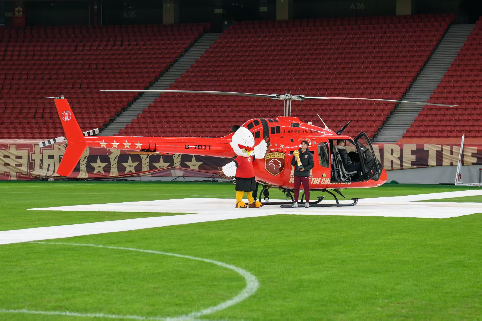 激动人心的夺冠视频过后,大家的目光被静候在内场的临港捷运纪念版直升机吸引,仪式开始前,这架直升机载着队长王燊超和奖杯从川沙飞抵球场。这一环节不仅是荣耀的展示,更是俱乐部积极探索“低空+足球”体旅融合新范式的生动实践。海港俱乐部与临港捷运本赛季已联合推出多次低空游览活动,通过拓展城市空域观赛新场景,延伸球迷体验的维度。未来,双方还将继续推进更多融合项目,共同助力上海低空经济生态的创新。