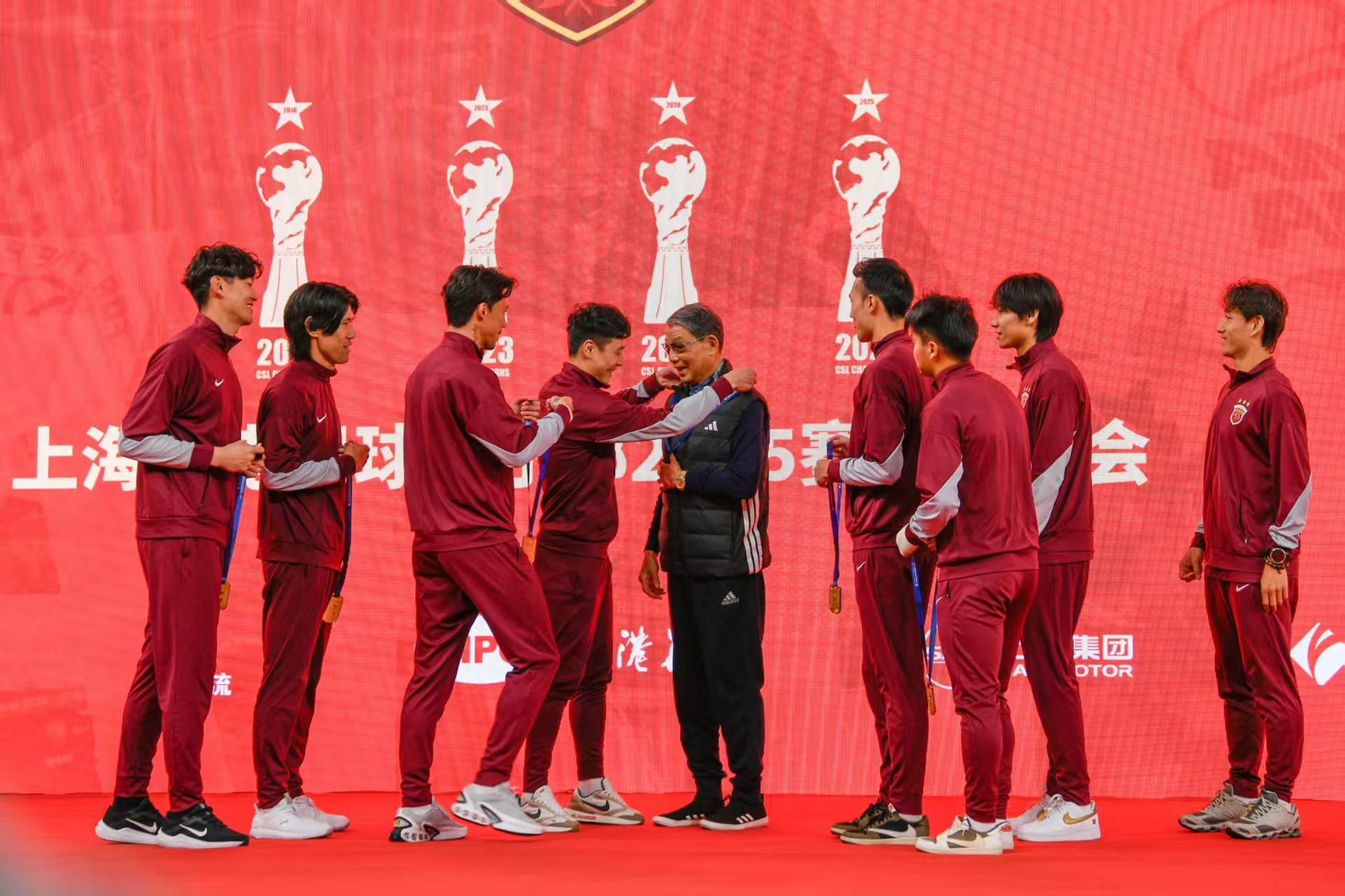 本次总结会特别邀请到中国足球名宿徐根宝指导亲临现场。看到从崇明基地走出的弟子们持续闪耀赛场,年轻新秀不断崭露头角,徐指导动情地说道:“祝贺海港取得三连冠,希望俱乐部再接再厉,给国家输送更多优秀的球员,让中国足球走向世界,祝海港成功!”话音落下,武磊、王燊超、颜骏凌、张琳芃、吕文君、刘若钒以及小将李新翔、蒯纪闻,共同为他们敬爱的恩师佩戴上2025赛季冠军奖牌。师徒同框,场面温馨感人。