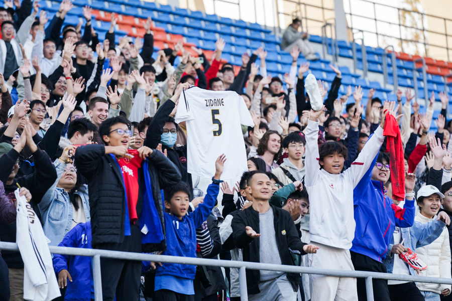 互动环节,齐达内为球员们签名合影,走向场边与观赛师生互动,并送上签名版的2026年FIFA世界杯官方比赛用球“三重浪”,将现场气氛推向高潮。据悉,本次活动吸引了4000余名师生到场见证。