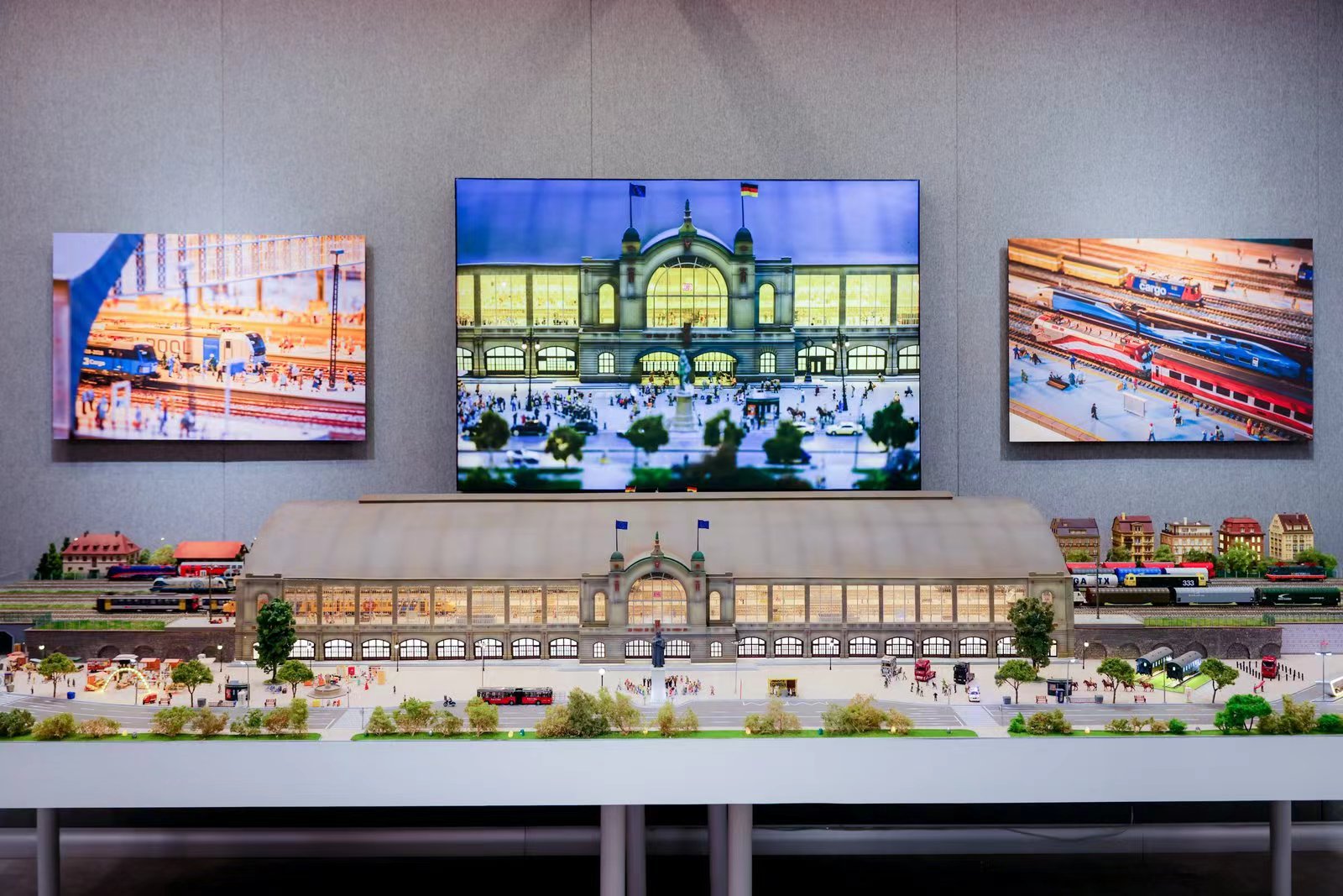 展览中《运转中的德国车站》沙盘里宏大的微缩场景同样让人惊叹。这是经典的HO比例(1:87)世界,它由大梦微城团队为本次展览特别创作并首次展出。据悉从设计到制作,团队耗时近2个月,以柏林中央车站等德国车站为原型并加以创想,增加了活动的人物和事件。沙盘面积超过4米长,继承了9条独立供电轨道,能实现多列火车自动调度与循环运行。数百个生动的微缩人物和故事等待观众去发现。