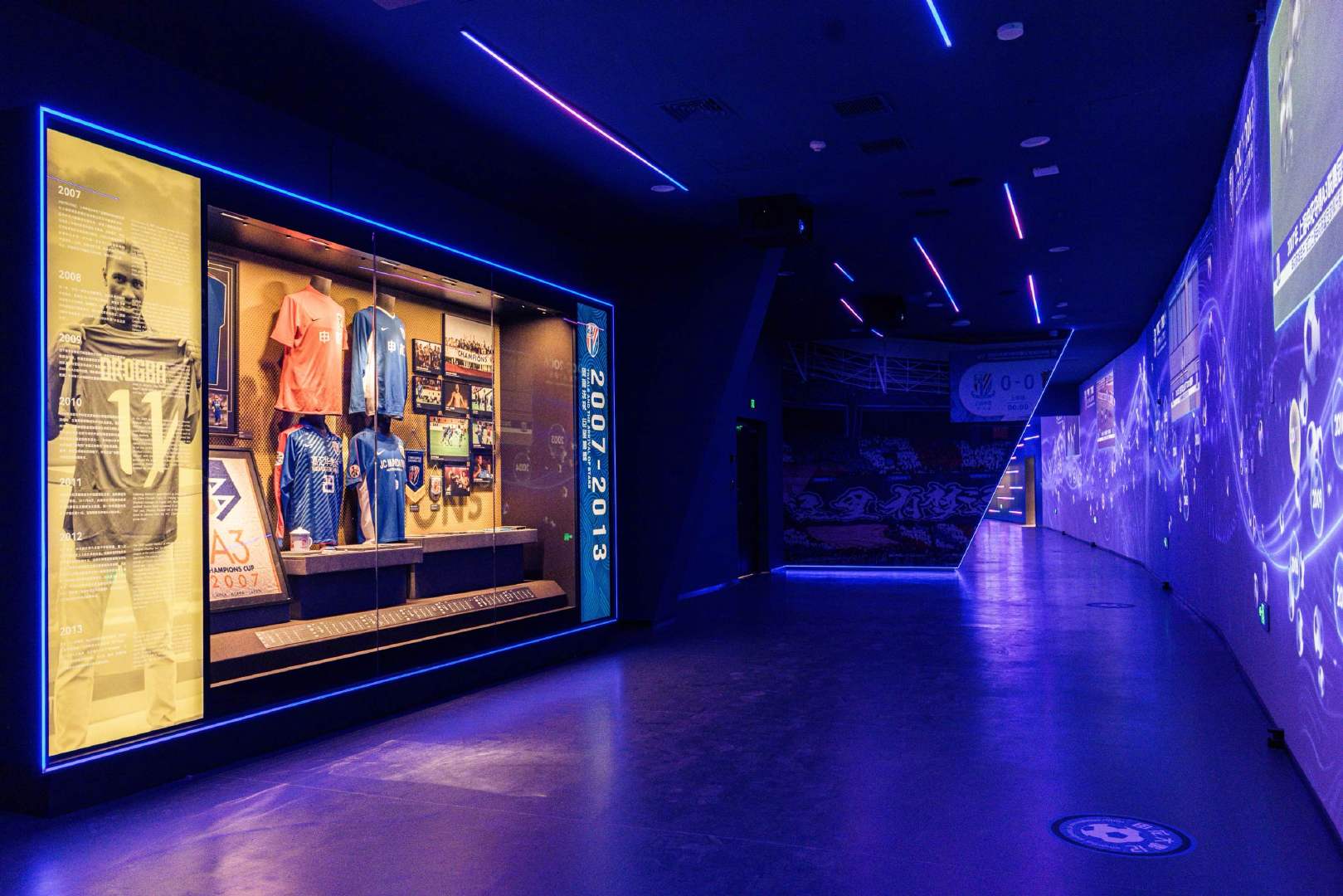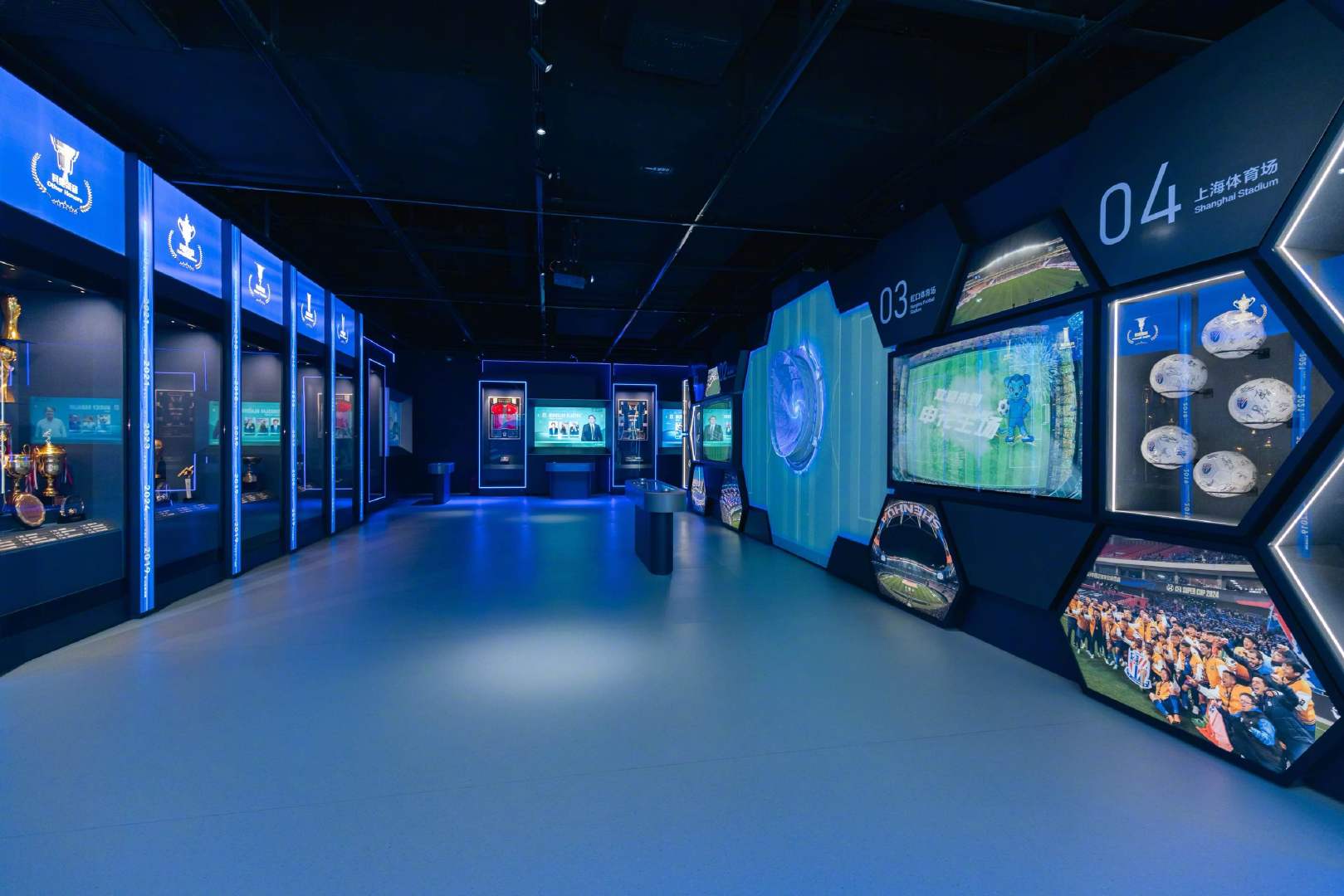 中心由三大功能板块有机融合,为访客提供沉浸式足球文化体验。作为项目的灵魂所在,申花文化体验中心通过长达50米的“申花之路”互动长廊、360度环幕沉浸的“巅峰时刻”影厅、结合红外感应与体感技术的“群星闪耀”及“功勋教练”互动展区,通过科技手段将申花俱乐部30余年历史转化为可触摸、可交互的生动叙事。