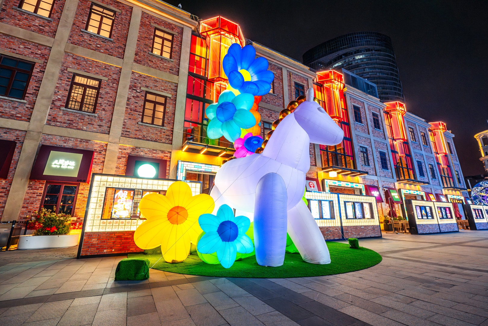 抬头望去,连续第5年举办的百年弄堂海派春节灯会,也悄然将整个街区焕新为骏马奔腾的奇幻之境,多组大型灯光艺术装置遍布弄堂,以浪漫、鲜活、互动为设计基调,将马的灵动、花的绚烂、春的暖意、节的热闹层层叠加,呈现出中西奇幻碰撞共生的又一年新意。比如位于南广场的“亮马生花”,以“繁花伴马贺新春”为创意原点,为马年注入活泼气息;弄堂屋顶上,“骏跃瑶台”粉蓝色飞马踏云而来,传递着“以梦为马,美好心愿皆成真”的真诚祝福;甜爱廊观景台沿廊的“驰梦甜爱”浪漫铺展出一幅“万马嬉花闹春图”;中庭的“驭马游春”则以旋转木马为灵感,构筑出欢腾互动的新春乐园。