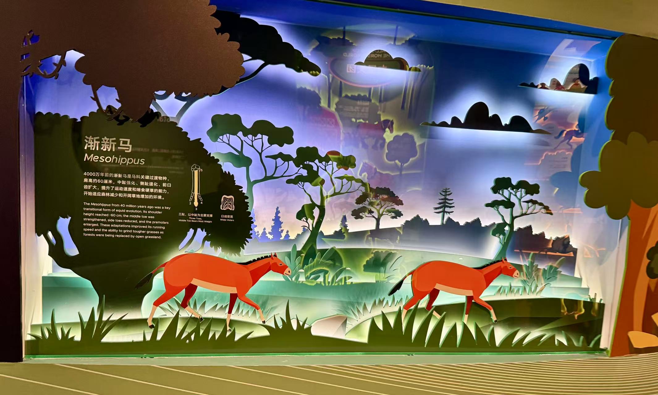 展览通过展示马蹄与臼齿的变化,清晰呈现了马类在自然选择下的进化轨迹:4000万年前的渐新马成为关键过渡物种;1800万年前全球气候干旱,草原古马完成了决定性转型;约400万年前,起源于北美洲的真马经白令海峡迁徙至欧亚大陆,凭借“铁蹄铜牙”的优势取代三趾马,驰骋草原至今。