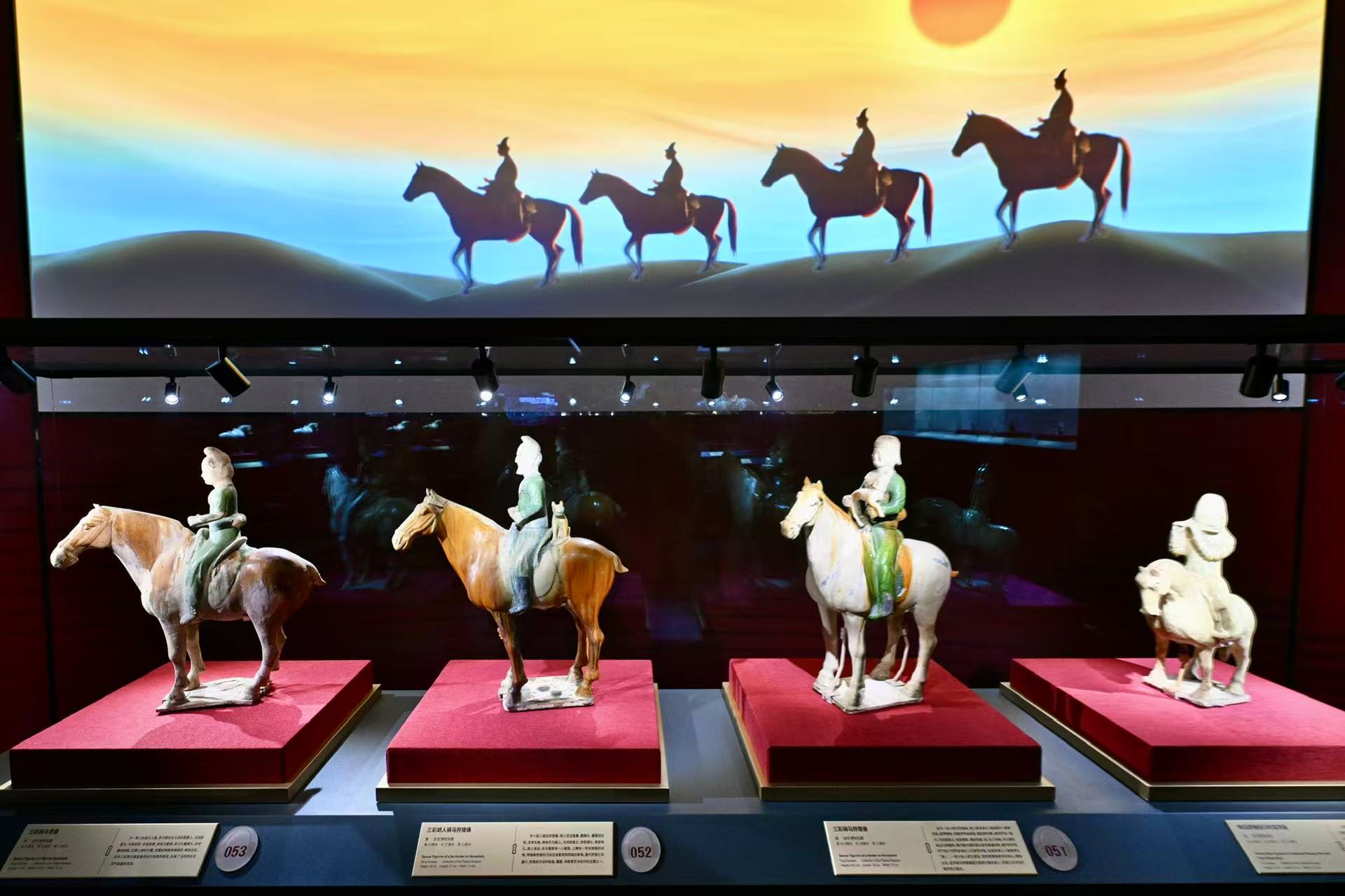 汉代陶彩绘马头以饱满形态和流丽彩绘,定格了骏马昂扬瞬间,不仅是汉代写实雕塑的杰作,更为研究当时的马种驯养提供了宝贵资料;唐代三彩马釉色绚若流霞,形神兼备,流畅线条与饱满体态凝聚着盛唐的蓬勃生机,成为盛世精神的视觉象征;隋唐三彩骑马人俑则以精湛造型,折射出胡汉交融背景下的多元文化图景,见证丝绸之路的文明互鉴。