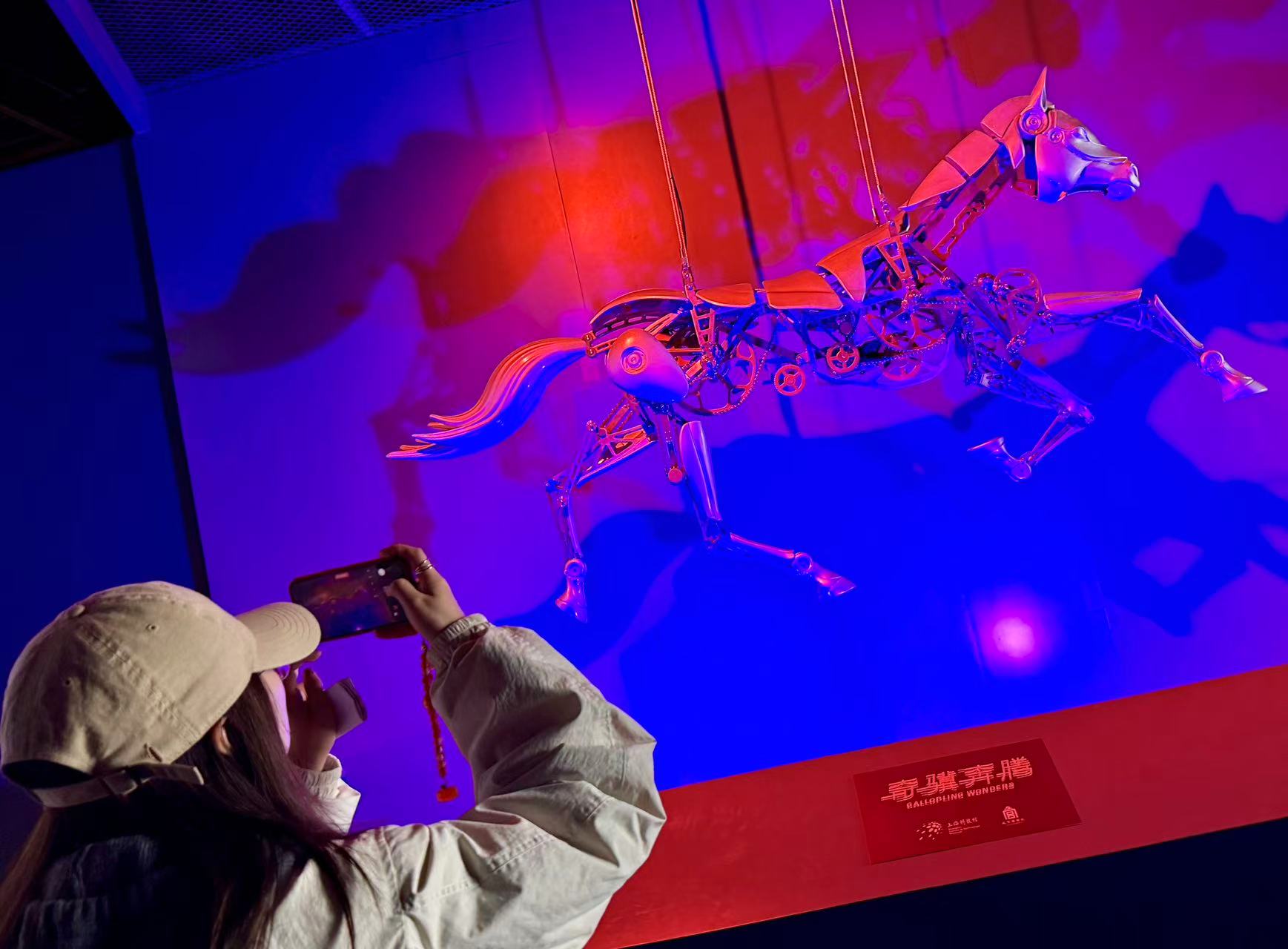 在展览尾声的“骥语共驰”空间,伫立着一匹持续奔腾的机械马,也是整个展厅的焦点之一,它是科技与艺术的完美融合,指向未来,点燃观众对科技发展的无限想象。
