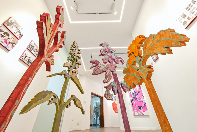 《长三角原生植物图谱》装置以十种长三角原生植物为原型。陈静将植物形态转化为剪影图像,保留辨识特征的同时赋予节奏动势。原本约二十厘米尺度的植物图像被放大十倍,采用五厘米厚的太空板切割成立体形态,使“小草本”在架空层中成为顶天立地的“大植物”,形成具有视觉张力的生态景观。