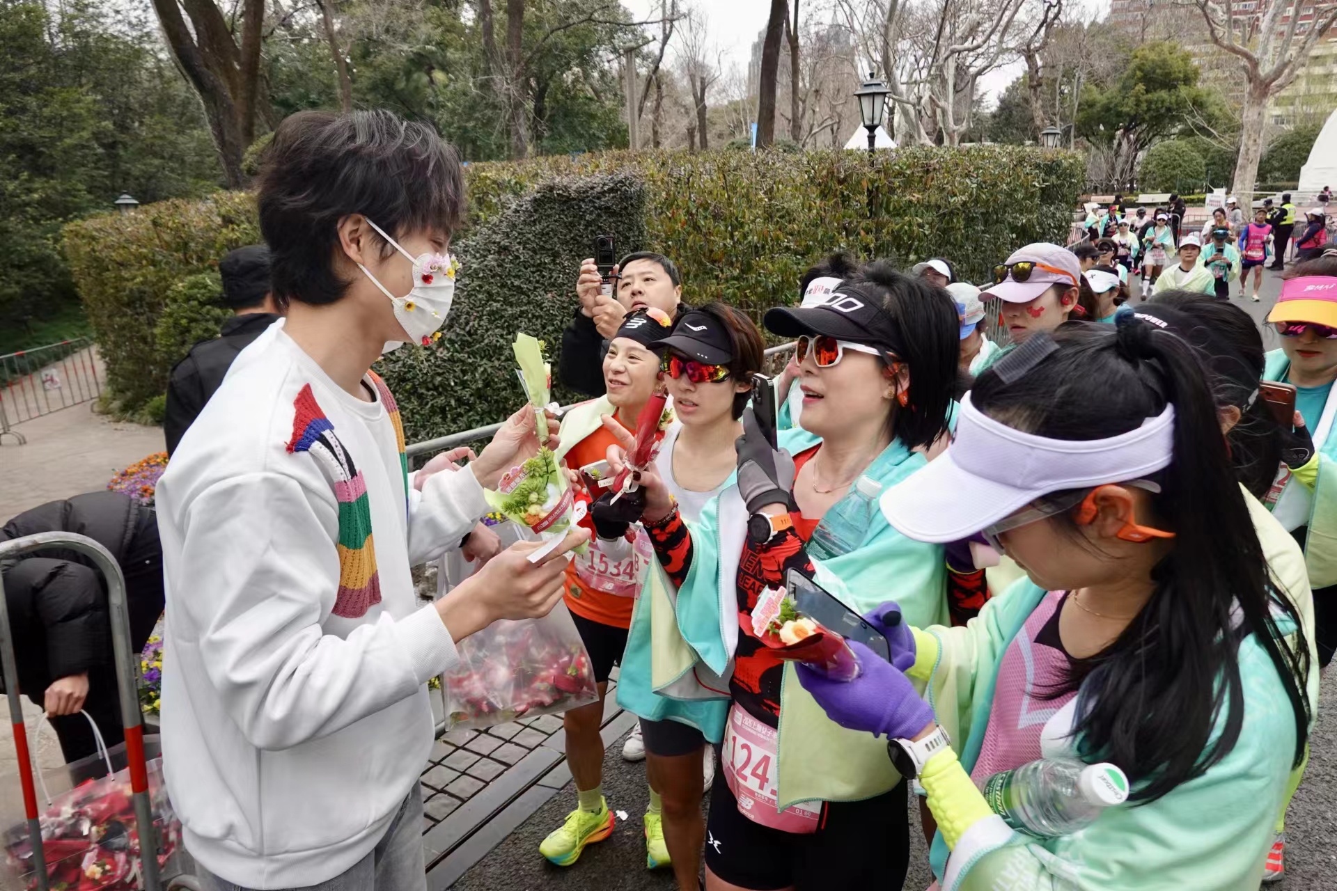 完赛的女跑者们在终点处迎来献花祝福。劳动报记者贡俊祺 摄影