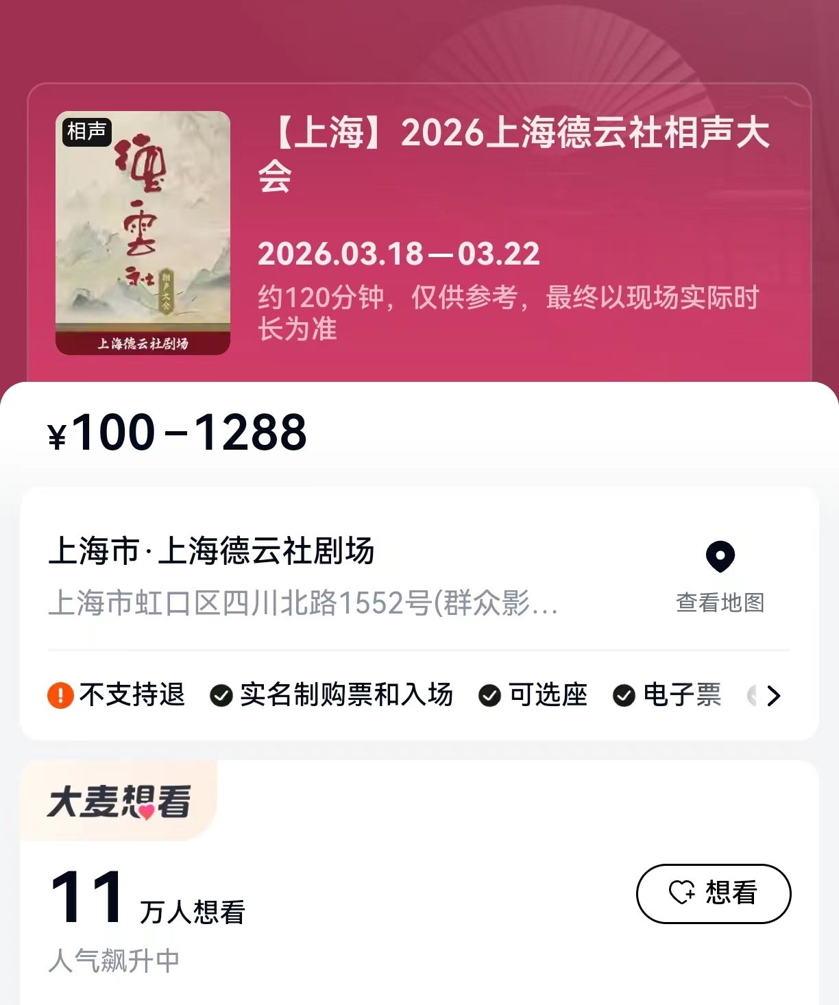 3月13日上午10点,剧场开业演出季——2026上海德云社相声大会在大麦网开票,仅仅4分钟,5天总计9场演出的所有门票便被抢购一空,平台显示超11万人投票“想看”,火爆程度可见一斑。