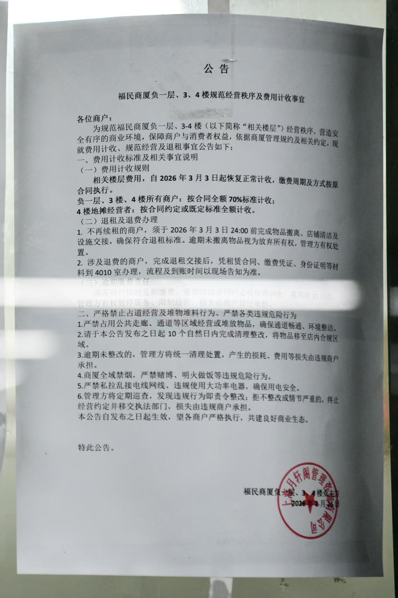 据物业方此前张贴的公告显示,自3月3日起,市场一度尝试恢复经营秩序并重新收取费用,对负一楼、3、4楼商户按合同金额一定比例收费,同时提出了禁烟、禁赌、禁明火做饭、禁占道经营等要求,释放出“逐步恢复运营、加强市场管理”的信号。