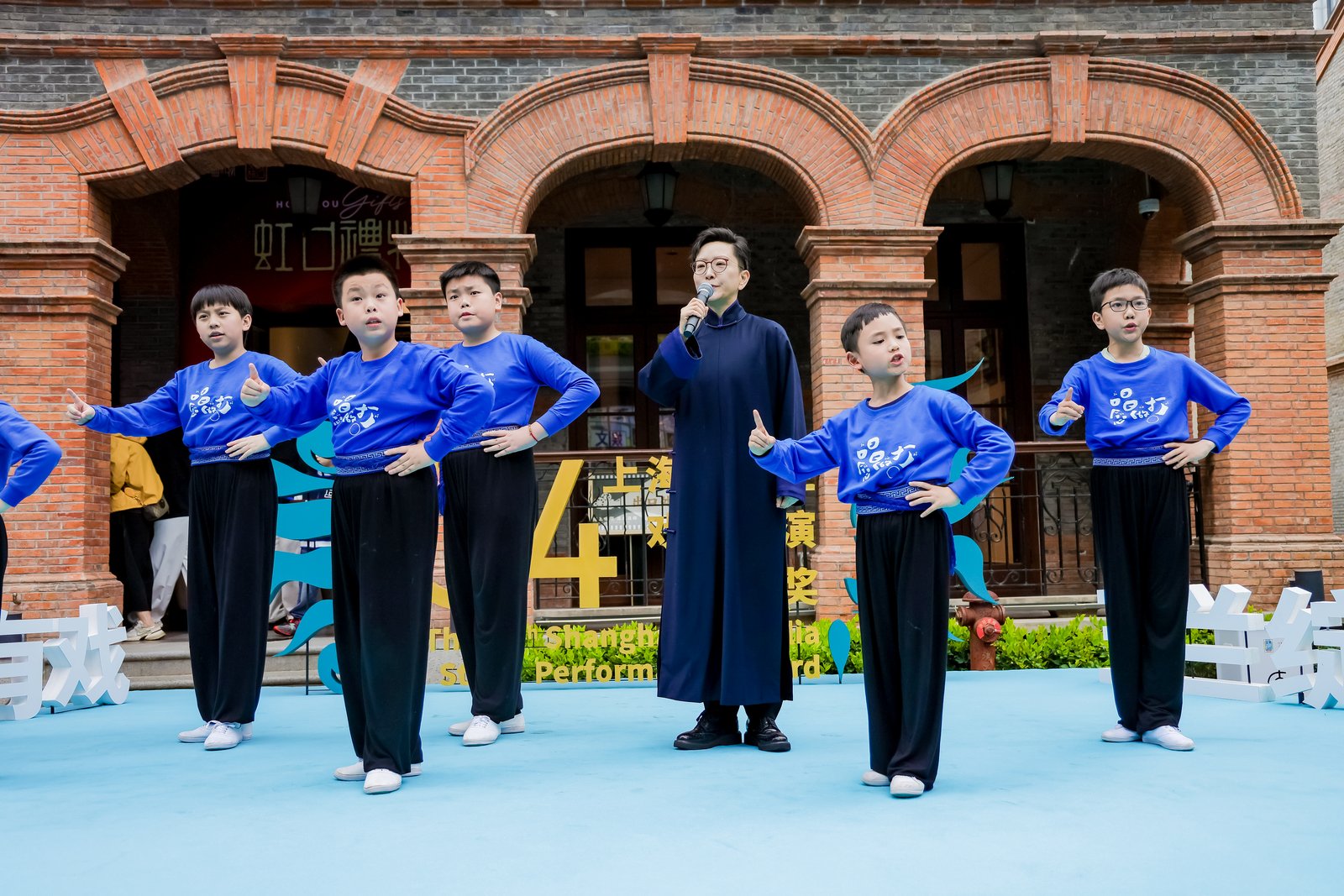 循声而去,虹口海派文化中心南侧的广场上,少儿京剧《卖水》吸引了不少人驻足。这些孩子是来自瑜音社京剧小科班的演员,尽管年龄小,却各个精气神十足,一招一式尽显扎实功底,彰显出国粹艺术薪火相传的蓬勃力量。随后,他们的老师、余派老生第四代传人王珮瑜也与他们同台亮相,带来京剧经典剧目《定军山》片段,醇厚苍劲的京腔在历史建筑间回响,尽显京韵风骨。