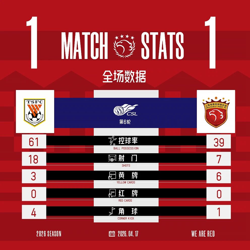 伤兵满营,惨烈平局。4月17日晚,2026赛季中超联赛第六轮在济南奥体中心体育场展开一场焦点对决,饱受伤病困扰的上海海港客场挑战兵强马壮的山东泰山。最终,海港以1比1战平对手,从客场带走宝贵一分,小将杨希攻入个人中超首球,为球队立下战功。