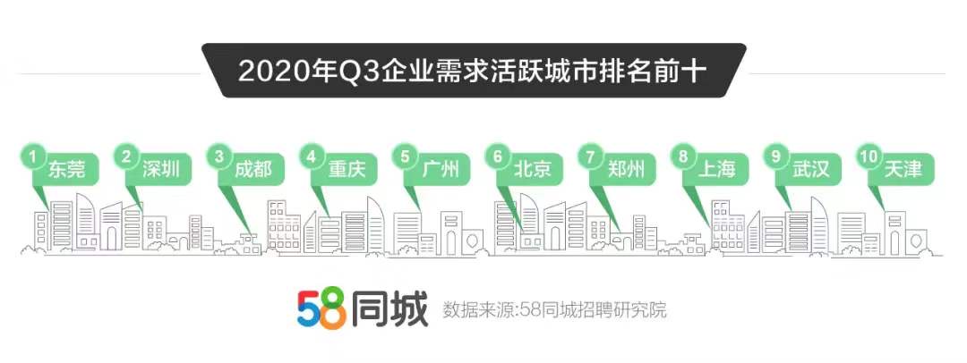 从城市维度看,58同城招聘研究院数据表明,今年三季度,企业招聘活跃城市TOP 10为东莞、深圳、成都、重庆、广州、北京、郑州、上海、武汉、天津。其中,东莞招聘需求同比上升高达97.11%,天津、重庆招聘需求同比增长约50%,深圳招聘需求同比上升34.82%。可见,东部沿海和西南地区企业在回暖复苏后,招聘需求集中释放。而制造业发达的东莞、港口运输兴盛的天津、服务业蓬勃发展的重庆,也迎来了企业集中招聘小高峰,招聘需求同比大幅度提升。
