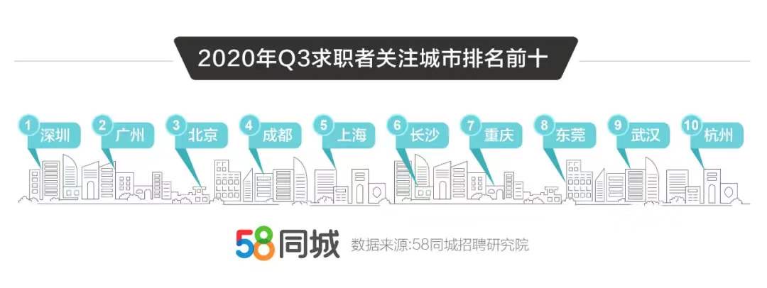 从求职情况来看,今年三季度,深圳、广州、北京、成都、上海、长沙、重庆、东莞、武汉、杭州位居求职热门城市TOP 10。这表明,各城市招聘和求职需求相对均衡,同时,求职者更青睐于在南部沿海和长江流域城市就业。尤其是四大一线城市,以较高的收入和较大发展前景吸引了众多应聘者,而成都也以宜居环境和时尚文化形成了“引就业”磁场。