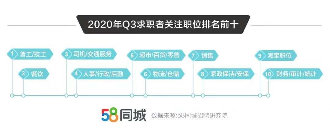 数据表明,2020年三季度,企业招聘需求排名第一的职位是普工/技工,其次是物流/仓储和餐饮。随着制造业企业返产复工,企业对技术工人的招聘需求随之增大。今年以来,物流/仓储业一直保持着较快发展势头,尤其是到常态化防控阶段,居民消费潜力释放,物流业市场需求增加,相应的岗位招聘需求随之增长。而经历了数月“闭关”后,餐饮企业重新开门营业,对餐饮员工的招聘需求大幅攀升。