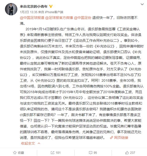 曾经效力申花的吕征,现在更多地是以“讨薪者”身份出现。1月2日,吕征晒出个人与北体大俱乐部签订的工资补充协议,控诉北体大拖欠自己工资一年多:白纸黑字,盖着公章,却张口否认真实性。这是时隔半年多后,他再次维权——2020年5月17日和25日,吕征曾经连续发布两篇微博维权。
