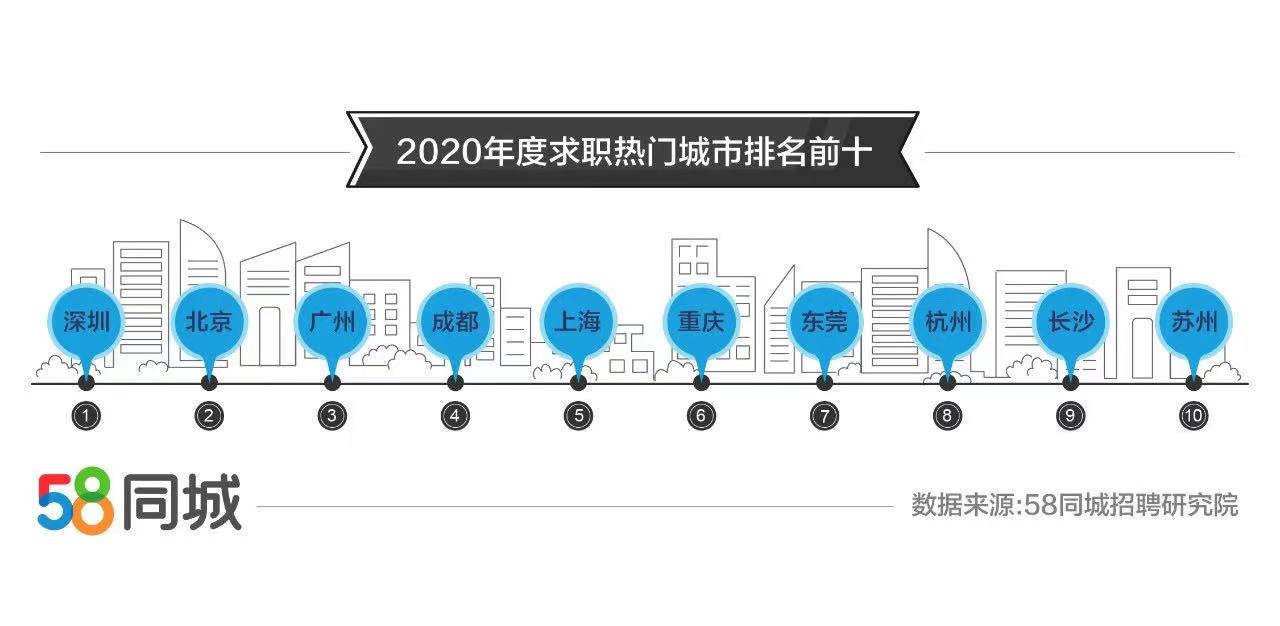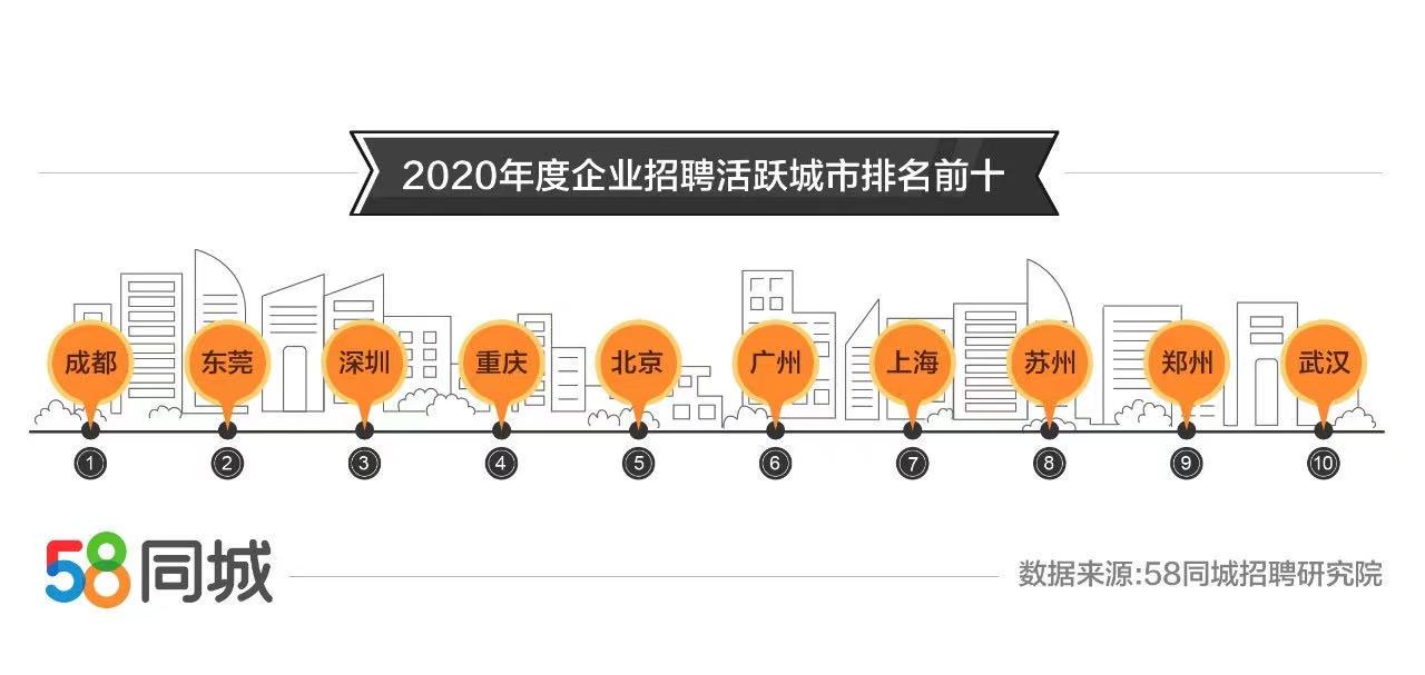 从城市维度来看,2020年,企业招聘最活跃的城市TOP 10为成都、东莞、深圳、重庆、北京、广州、上海、苏州、郑州、武汉。2020年,深圳、北京、广州、成都、上海、重庆、东莞、杭州、长沙、苏州位居求职热门城市TOP 10。一线城市4月求职需求同比增长较快,达14.92%,新一线城市4月求职需求同比增幅达到32.69%,这表明一线和新一线城市备受求职者青睐。此外,因受疫情冲击较轻,二至五线城市求职需求在2020上半年也有较快增长。