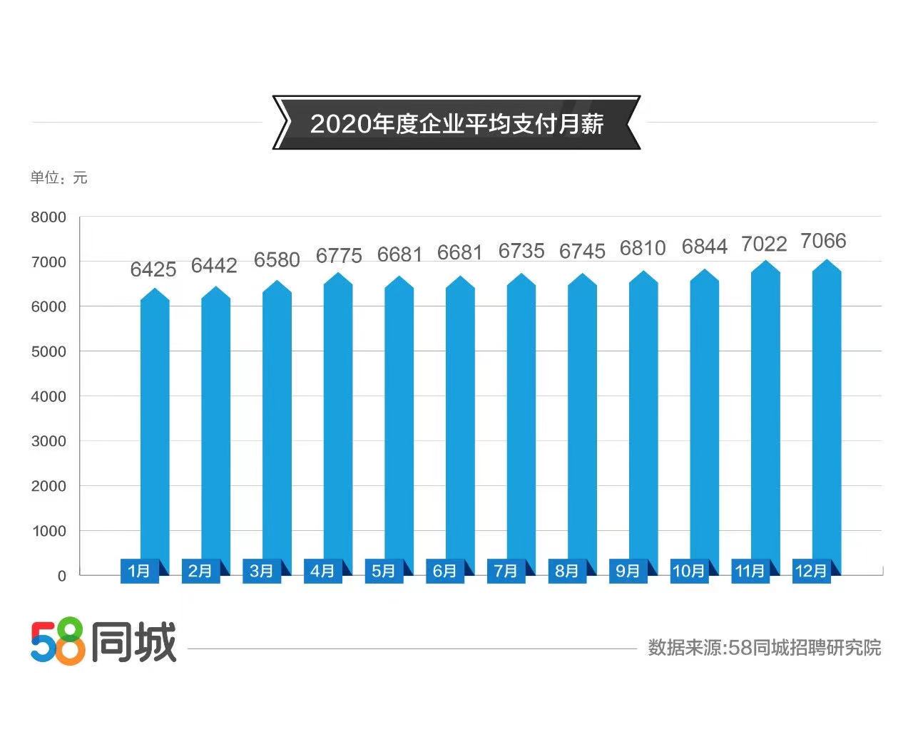 数据显示,从月度上看,2020年支付薪资一直呈现增长趋势,12月企业支付月薪达到峰值,为7066元,同比增长9.35%。5月,企业支付月薪同比增速最快,达到9.77%,月薪达6681元。尽管在2020年,各行各业受到疫情冲击,但劳动者收入水平仍有较大幅度的提高,人力资源价值的提升使求职者从劳动中分享到更多红利。