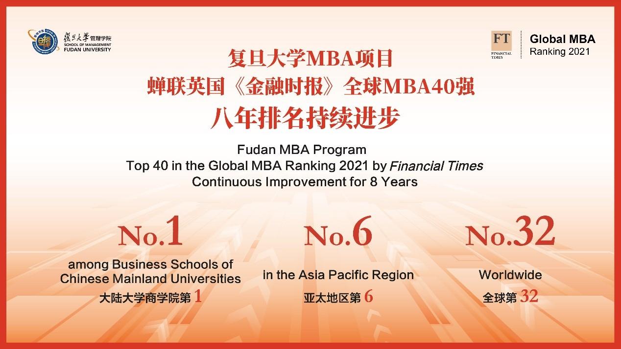 2月8日,英国《金融时报》(FT)发布2021年全球MBA项目百强榜单。复旦MBA项目位列全球第32位、亚太第6名、大陆大学商学院第1名,连续三年稳居全球前40强,八年排名总成绩持续提升。