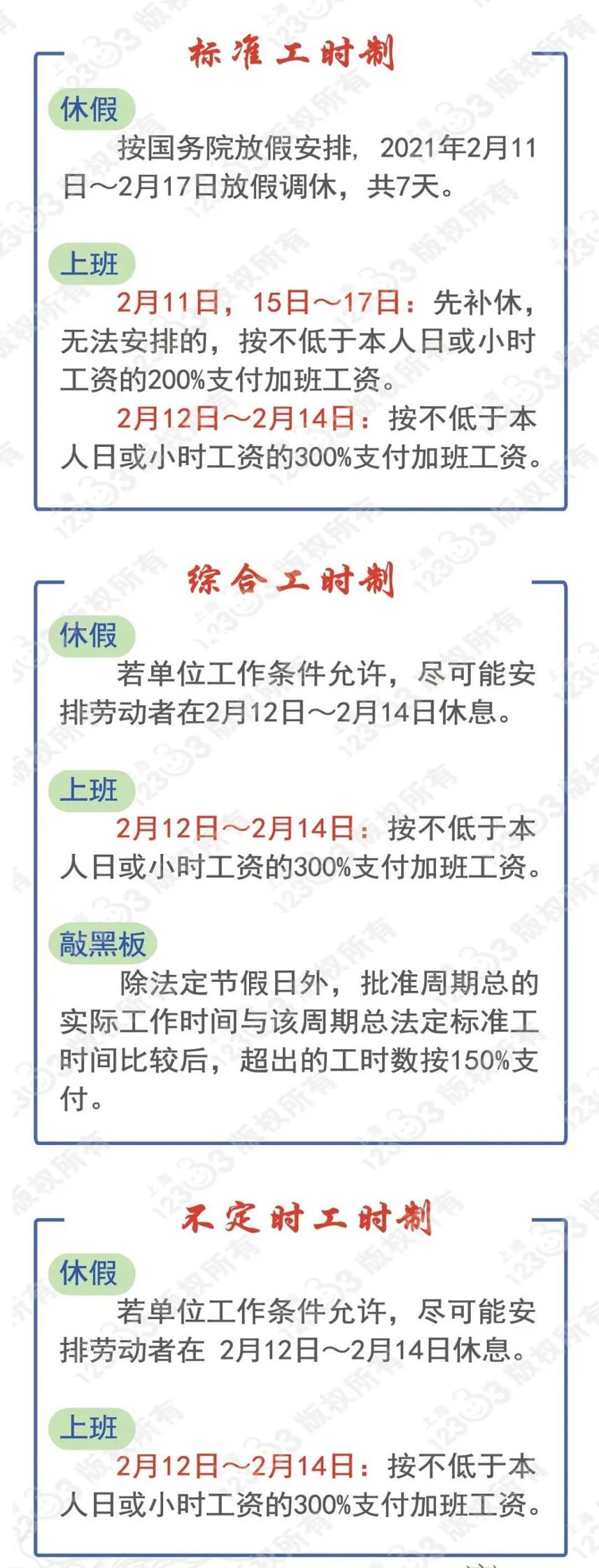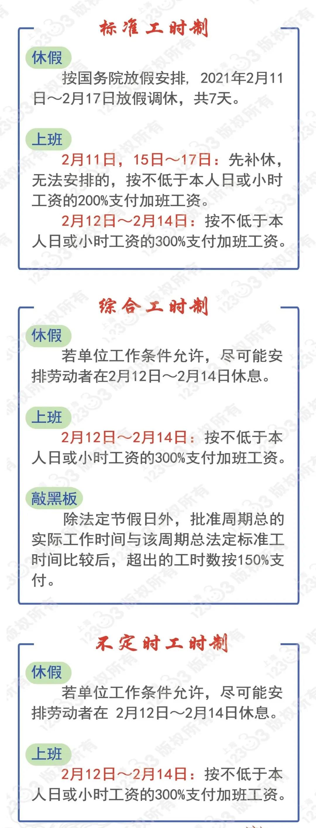 市人社局说,春节7天长假中农历正月初一至初三(2月12日-14日)为法定休假日,标准工时制、综合工时制、不定时工时制等不同工时制度休假或是上班,待遇各不相同。详见↓