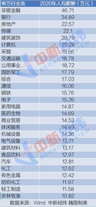 在A股的各大行业中,金融业打工人的人均薪酬一骑绝尘。Wind数据显示,去年非银金融和银行业的人均薪酬分别为46.71万元和34.89万元,分列申万28个一级行业中的第一、第二名。需要注意的是,由于ST西水公司员工数量较上年骤降八成以上,导致人均薪酬计算结果过高,故将其从非银金融中剔除。