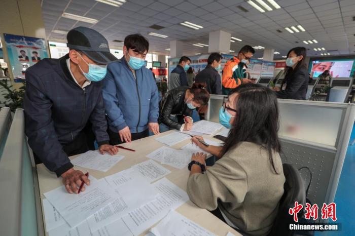4月2日,北京市顺义区人力资源市场内,求职者(左)与用工企业交谈。 中新社记者 贾天勇 摄