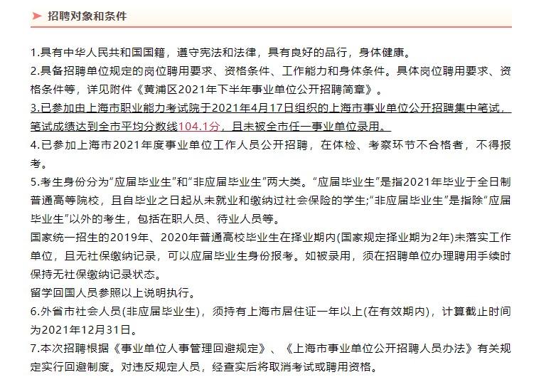 要求已参加由上海市职业能力考试院于2021年4月17日组织的上海市事业单位公开招聘集中笔试,笔试成绩达到全市平均分数线104.1分,且未被全市任一事业单位录用。