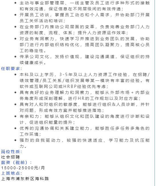 中科方德软件有限公司正在招聘HRBP,要求本科及以上学历,3-5年及以上人力资源工作经验,在招聘/绩效管理/员工关系/组织发展等某一模块有丰富的经验。有软件或互联网公司或HRBP经验优先考虑。