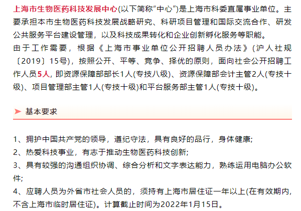 上海市生物医药科技发展中心面向社会公开招聘工作人员5人,即资源保障部部长1人(专技八级)、资源保障部会计主管2人(专技十级)、项目管理部主管1人(专技十级)和平台服务部主管1人(专技十级)。