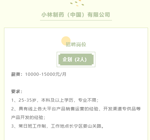 小林制药(中国)有限公司正在招聘2名企划,要求25-35岁,本科及以上学历,专业不限。