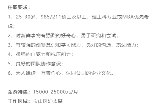 薪资待遇:15000-25000元/月;工作区域:宝山区沪太路。