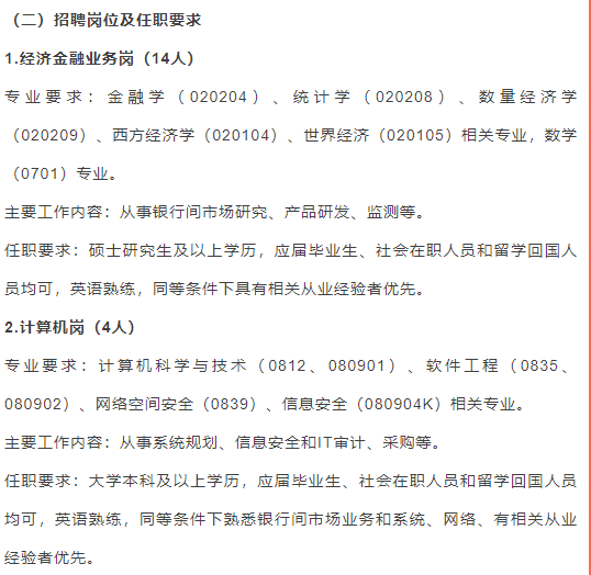 其中,经济金融业务岗招聘14人,要求硕士研究生及以上学历,应届毕业生、社会在职人员和留学回国人员均可,英语熟练,同等条件下具有相关从业经验者优先。