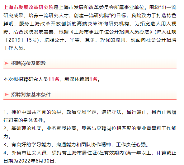 上海市发展改革研究院现面向社会公开招聘工作人员,拟招聘研究人员11名、新媒体编辑1名。