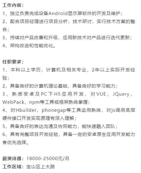 要求本科以上学历,计算机及相关专业,2年以上实际开发经验;熟悉安卓及PC下H5应用开发,对VUE、JQuery、WebPack、npm等工具或框架熟练掌握等。