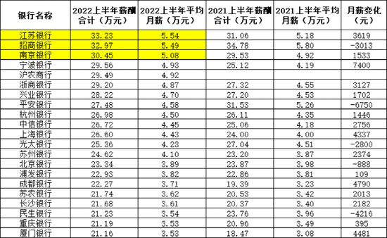 在目前A股上市的42家银行当中,江苏银行、招商银行、南京银行上半年平均月薪都超过5万元,分别为5.54万元、5.5万元、5.08万元,江苏银行、南京银行上半年平均月薪增加了3619元、1533元,而招行则是下降了3013元。此外,宁波银行、沪农商行的平均月薪也超4.9万元,浙商银行、兴业银行、平安银行的平均月薪超过4.5万元。