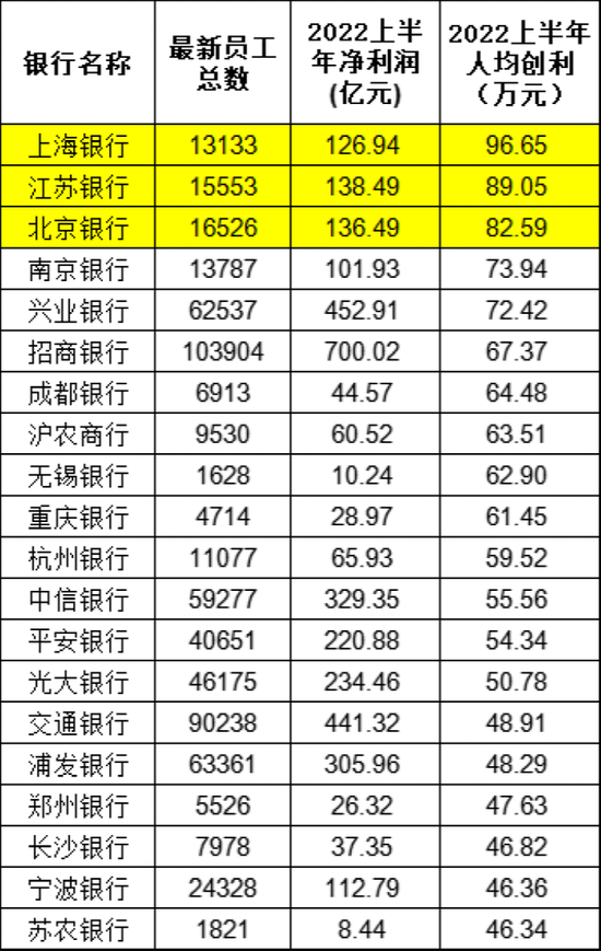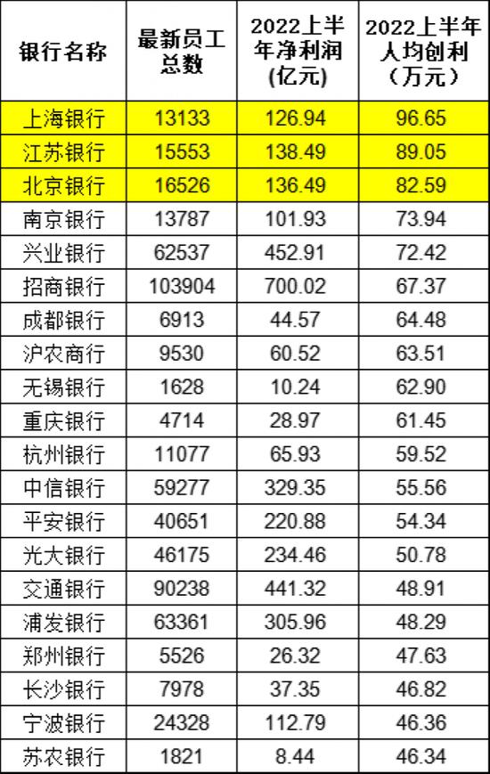 从人均创利来看,上海银行以96.65万元居首,江苏银行为89万元,北京银行也超过80万元。