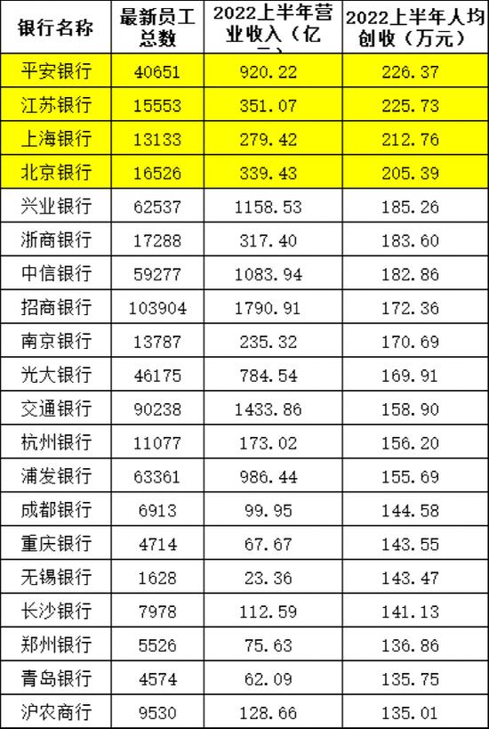 从人均创造营业收入和人均创造净利润来看,平安银行以人均创收226万元位居首位,江苏银行、上海银行、北京银行人均创收也超200万元。