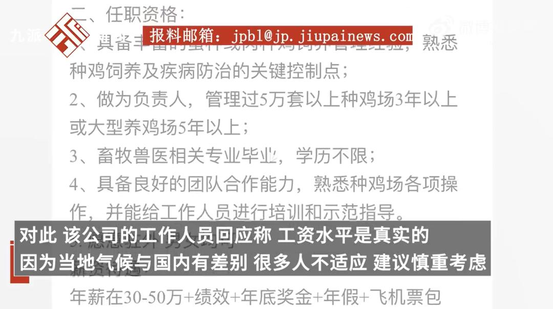 据媒体报道,工作人员回应称场长只要工作经验足够,是可以达到所说的工资标准的,但是该地的工作环境和国内还是有差别,比较艰苦,当地气候和国内不一样,有的人不适应当地的气候就不干了,不是所有人都可以适应的。“有很多发简历的,真正适合的不是特别多。”