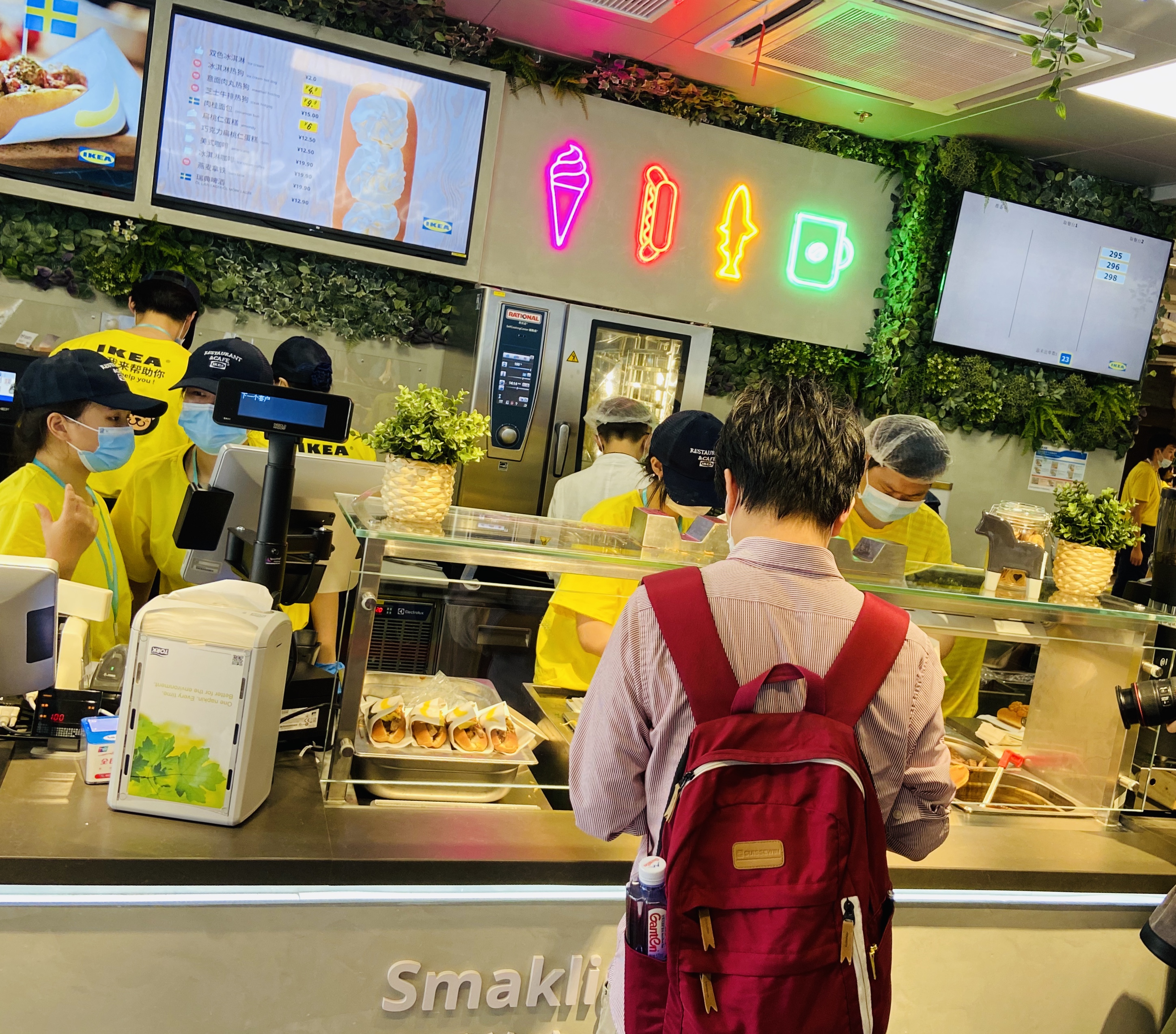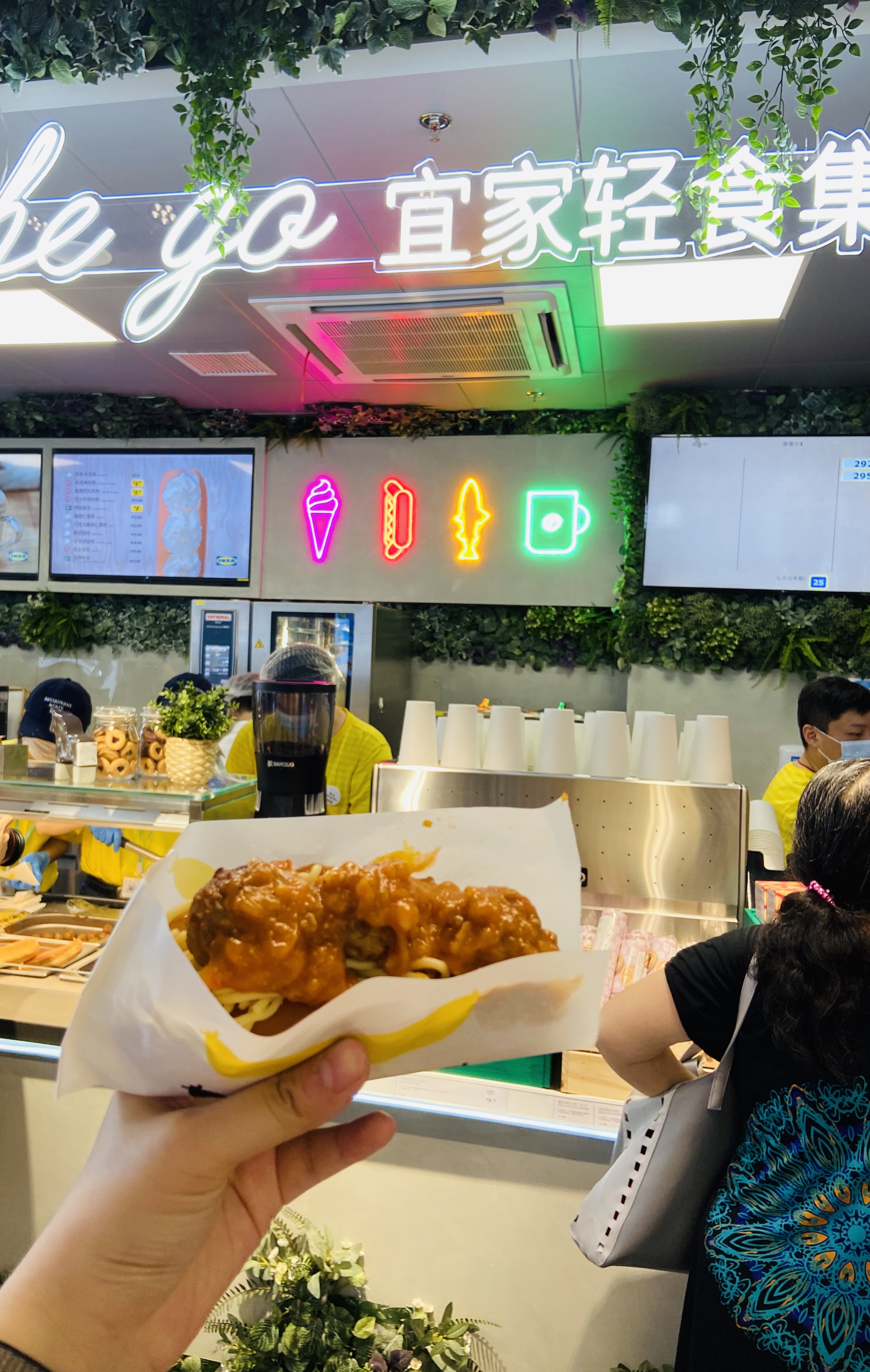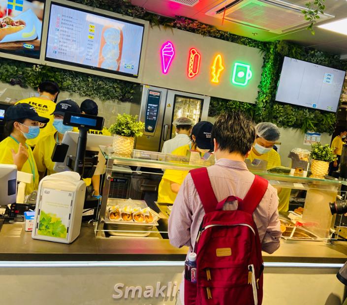 排了将近40分钟,终于进来,门口小姐姐微笑着面对每位顾客:“欢迎光临宜家。”受到如此热情的迎接,笔者一扫汗流浃背的疲倦,兴冲冲跑到一楼的轻食点单区,迫不及待尝一尝升级版肉丸热狗。