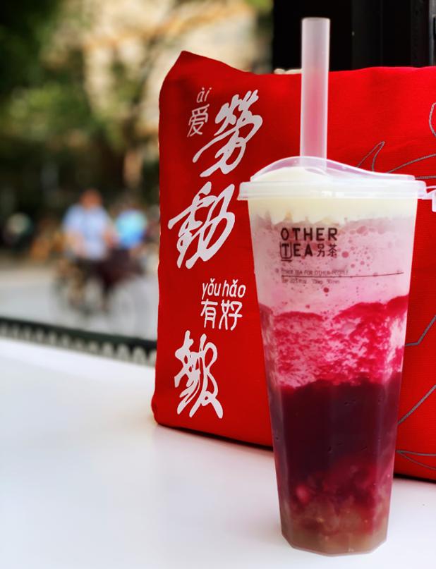 在幸福集市入口,有一家OT另茶,他家特色是锅煮鲜奶茶。有网友评价他家的奶茶:“茶与奶的完美融合,喝完唇齿留香。”除了锅煮奶茶外,店员表示,现在天气热,一些冰镇水果茶也卖得很好,比如大力洛神葡萄、花椰牛油芒果等。