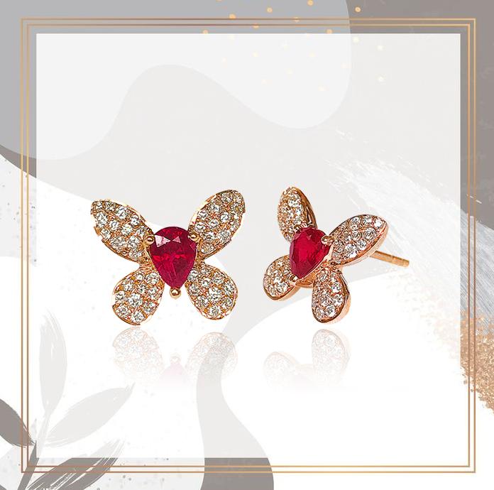 在选对合心合意的款式的同时,饰品的寓意也非常重要,在珠宝设计师的眼中,蝴蝶是艺术的精灵,蝴蝶同音“福迭”,喻示幸福如期而至,象征佩戴之人的福气会源源不断的到来。老凤祥以蝴蝶作为设计灵感,将蝴蝶的婉约和轻灵与靓丽的红宝石相结合,镶嵌18K金和多颗圆形切割钻石,展现蝴蝶律动的翅膀。红宝石热情大方,配以蝴蝶的婉约可人,深受女性吸引,萦绕在其耳畔,非常适合优雅妩媚的女性。