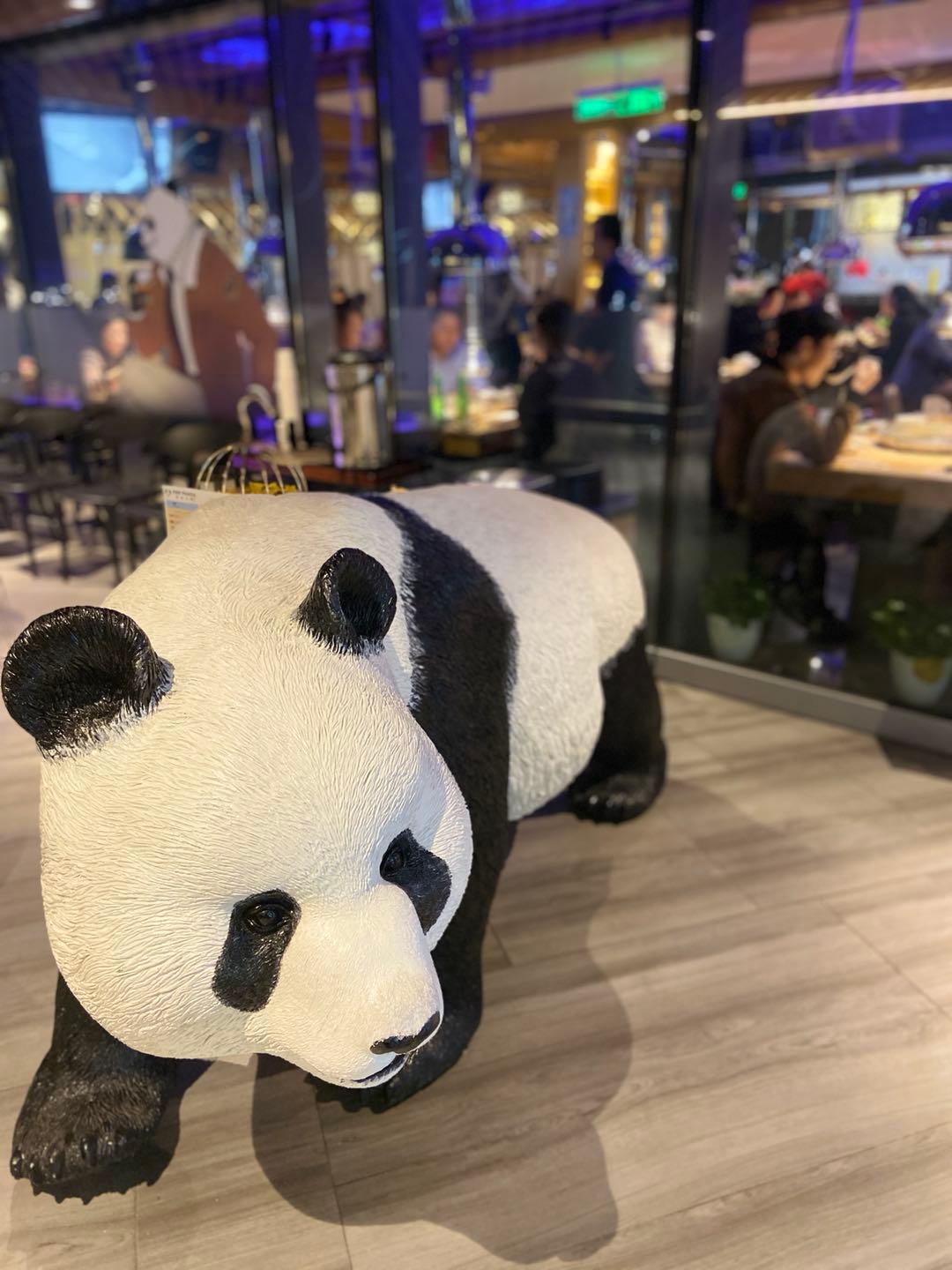 晚上19:30,位于白玉兰广场2楼的熊猫老灶火锅店内分外热闹,此时正赶上“熊猫”巡演。只见一只特大号“熊猫”捂着嘴巴、一扭一摆地向场内走来。来到餐厅中庭停下,随着节奏开始摆动着并不灵活的身躯,一只手向上、一只手伸出,在中庭内开始旋转,一时间引来阵阵掌声。