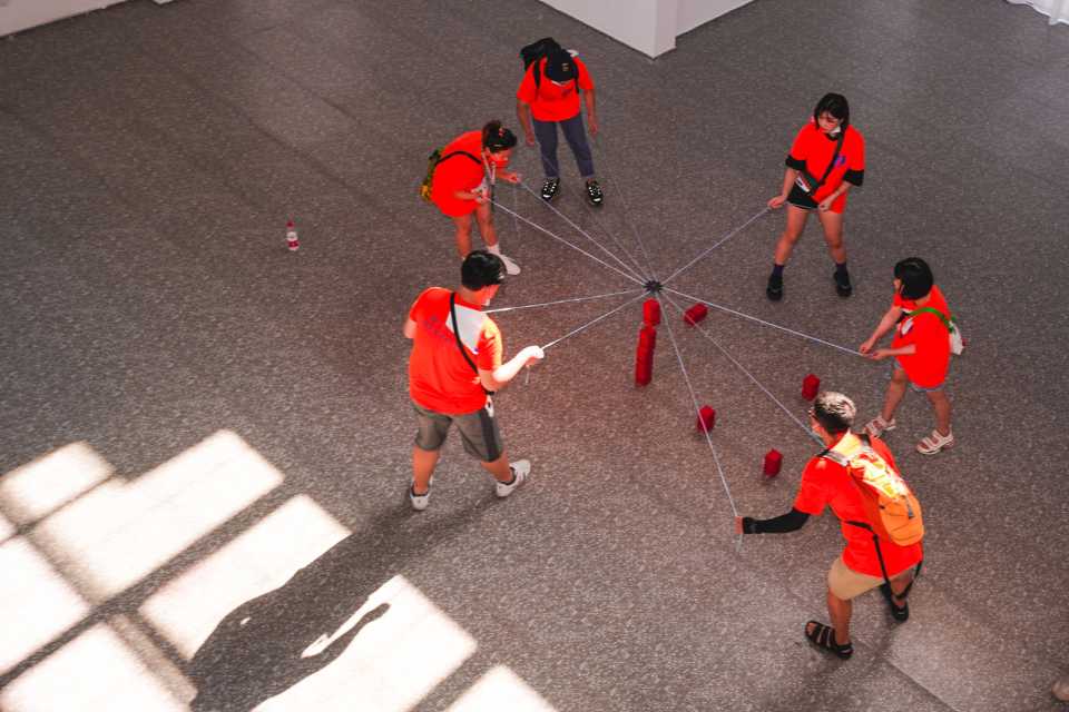 来到老码头景区内,两支队伍正在同场完成竞技任务。每队6位队友,合力牵引绳索,不断叠高任务方块。最终其中一队在规定时间内成功叠放了更多任务方块而胜出。