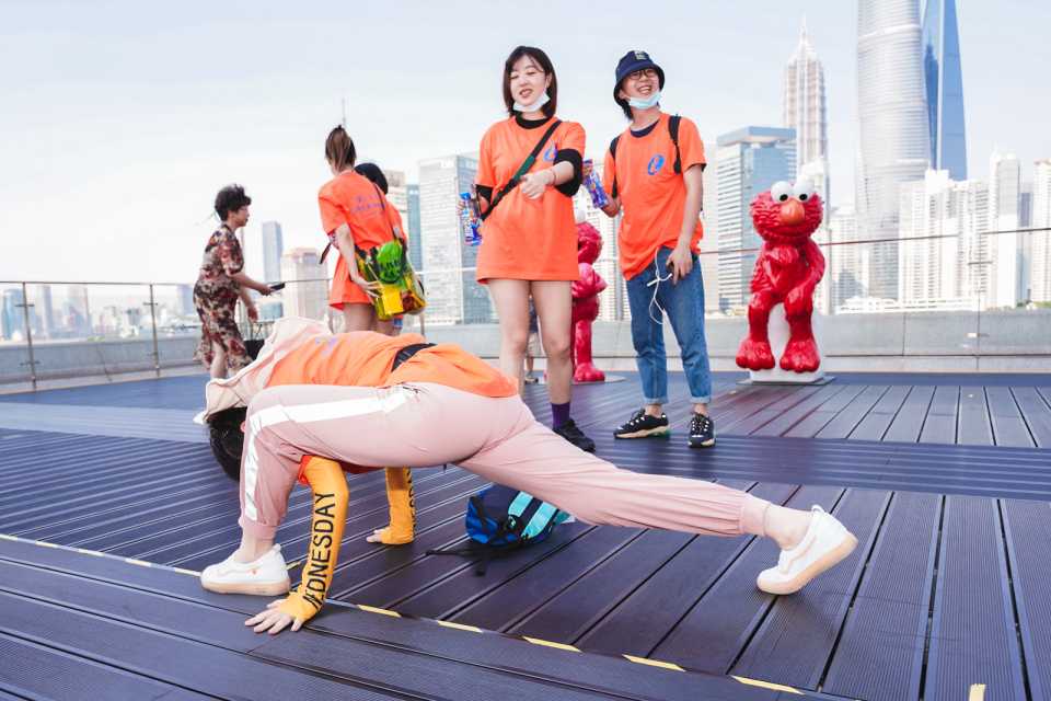 在BFC外滩金融中心的五楼露台上,抵达的队员们拉筋抬腿,认真热身。“人接人”脚碰脚地完成了“一字马”任务。