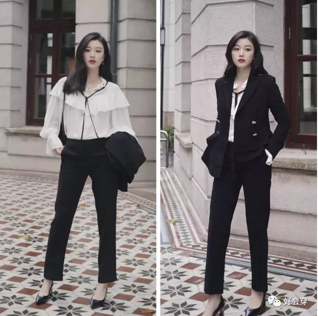 星期一是新的工作日开始,一般情况下都会有相对比较重要的会议或者工作安排,所以在穿搭上既不能马虎,也不能过于休闲。整体还是经典的黑白配,西服套装的剪裁是比较修身的款式,简单大方,更具有英气和职业感。